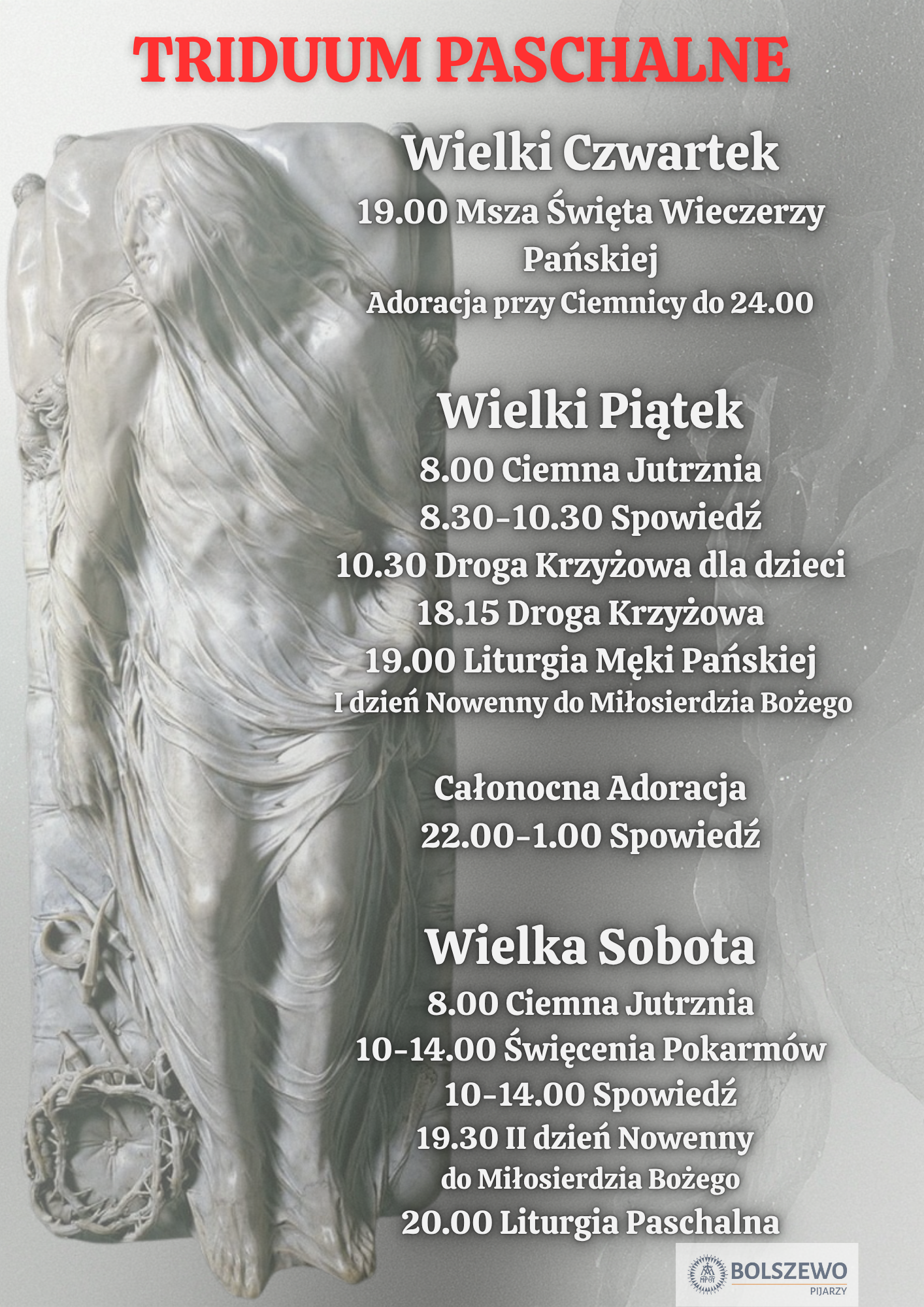 8. W Wielki Piątek Kościół medytuje Męką Chrystusa, który Ofiarował się za zbawienie całego świata. Adoracja Najświętszego Sakramentu w Ciemnicy od godz. 8.00 do 19.00. O godz. 8.00 zapraszamy na Ciemną Jutrznię. Spowiedź rano od godz. 8.30 do 10.30. O godz. 10.30 Droga Krzyżowa dla dzieci oraz o 18.15 dla ogółu wiernych. Liturgia Męki Pańskiej rozpocznie się o godz. 19.00. Na zakończenie Liturgii Najświętszy Sakrament zostanie przeniesiony do ołtarza Grobu Pańskiego. Adoracja rozpocznie się nowenną przed Uroczystością Miłosierdzia Bożego. Prosimy Strażaków z OSP Bolszewo o wartę przy Grobie Pańskim. Także od godz. 22.00 do 1.00 będzie można skorzystać z sakramentu pokuty. Przypominamy, że w Wielki Piątek obowiązuje post ścisły, ale zachęcamy do zachowania wstrzemięźliwości od pokarmów mięsnych, aż do celebracji Wigilii Paschalnej.