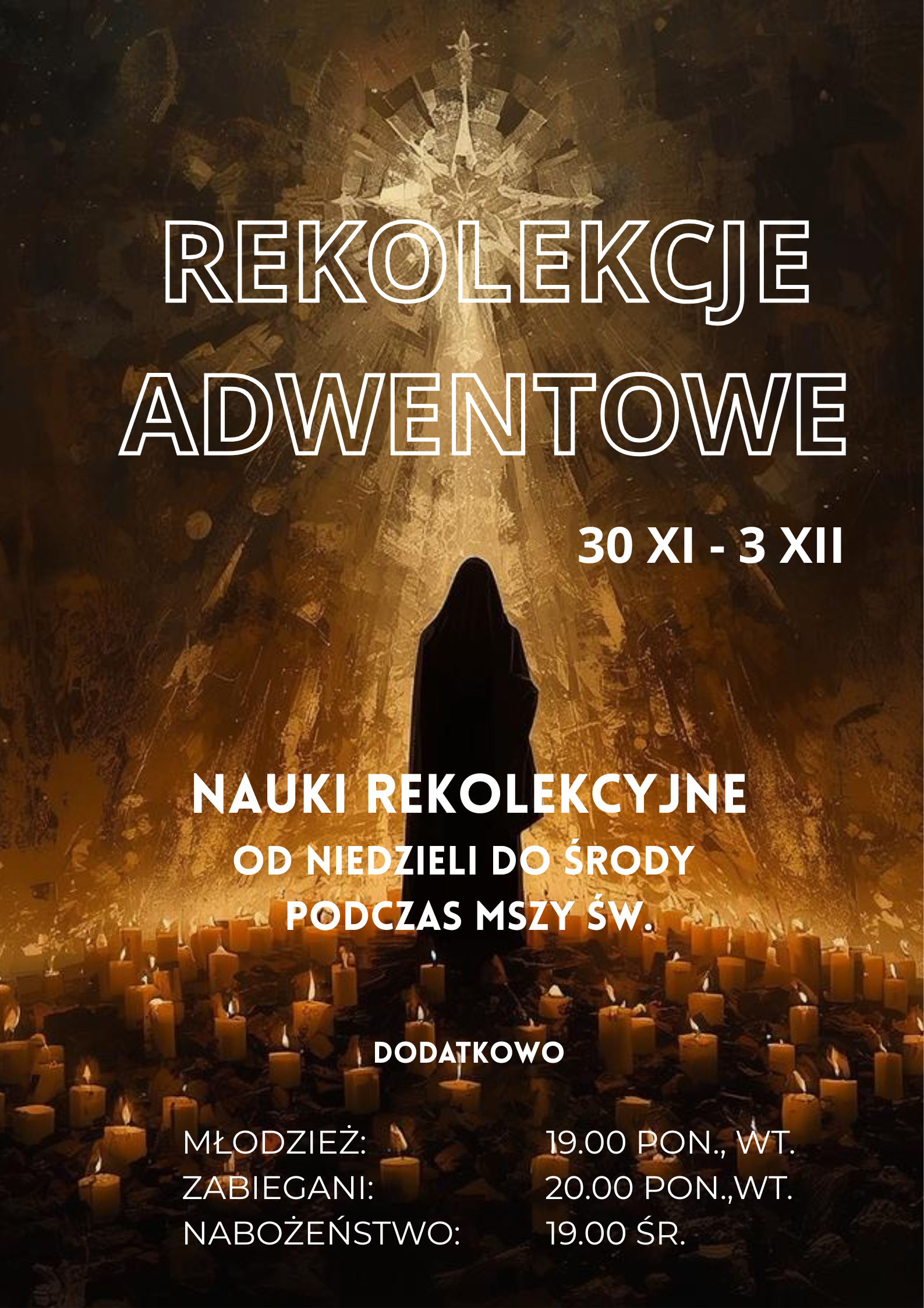 1. Rozpoczynamy nasze Adwentowe Rekolekcje Parafialne, które w tym roku głosi o. Marian Galas dyrektor naszej pijarskiej Szkoły w Katowicach. Nauki będą głoszone do środy włącznie podczas Mszy Świętych o godz. 5.45, 8.00 i 18.00. Dla młodzieży i kandydatów do bierzmowania w poniedziałek i wtorek o godz. 19.00, dla zabieganych w poniedziałek i wtorek o godz. 20.00. W środę na zakończenie rekolekcji nabożeństwo uwielbienia z modlitwą wstawienniczą o godz. 19.00. We wtorek i środę jako wyraz naszej wdzięczności będziemy mogli złożyć na tacę ofiary, które będą przeznaczone na funkcjonowanie wspólnoty o. Mariana.