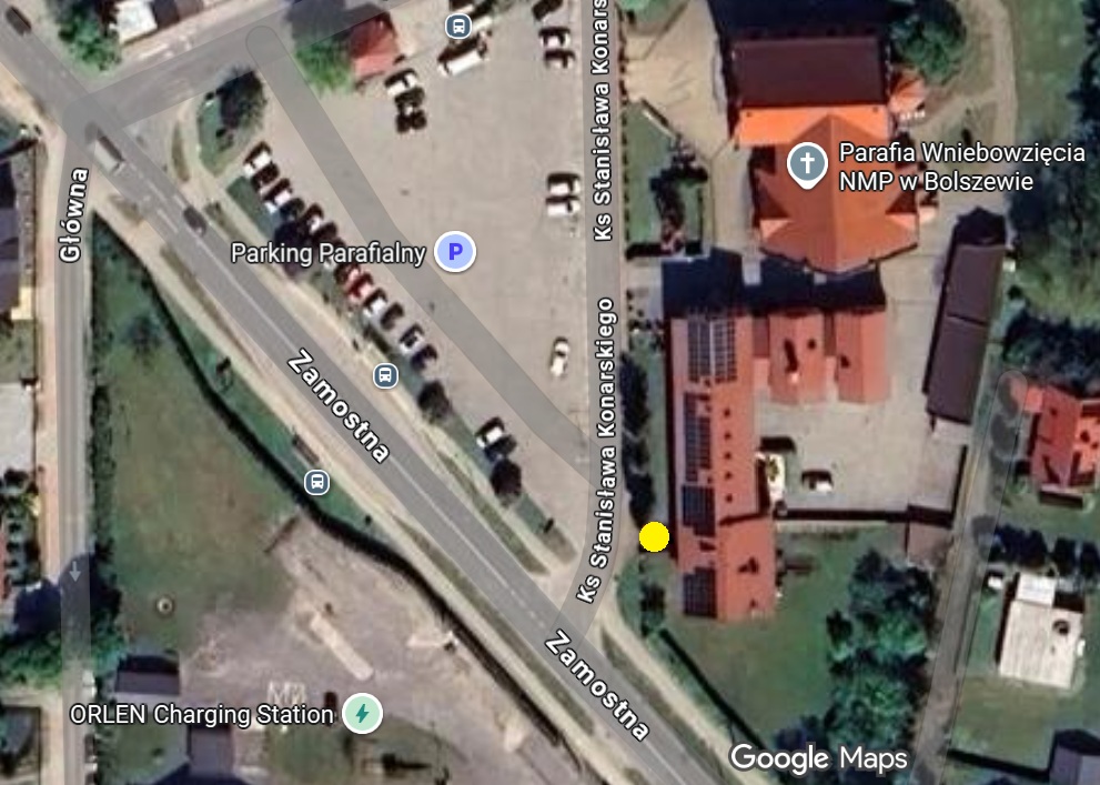 Aby dotrzeć do CKC, jeśli stoi się przed kościołem należy opuścić teren placu przed głównym wejściem do kościoła, skręcić w prawo na ulicę Ks. Stanisława Konarskiego i przejść wzdłuż budynku parafialnego do południowego narożnika, gdzie znajduje się żółta kropka.