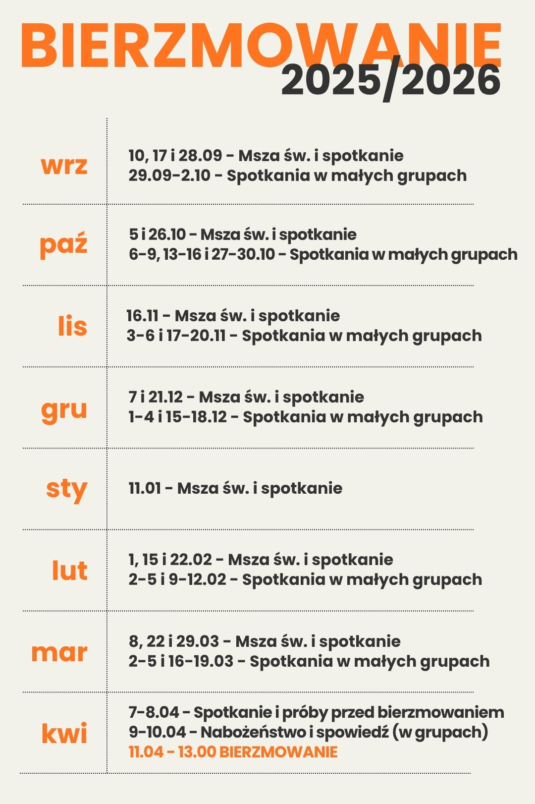 Sakrament bierzmowania młodzież przyjmie na wiosnę 2026 roku. Dokładna data uroczystości zostanie podana w lutym 2026 roku.