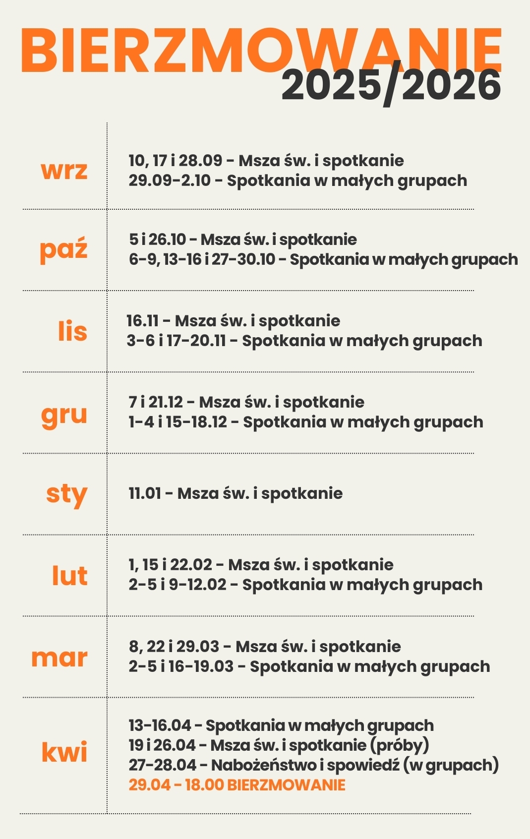 Przygotowanie do bierzmowania zakłada, że każda z osób uczestniczy co niedzielę w Mszy św. ale raz w miesiącu zapraszamy do przeżycia jej wspólnie w gronie wszystkich kandydatów a może i rodziców i rodzin. Zapraszamy na Msze św. o 18.00.